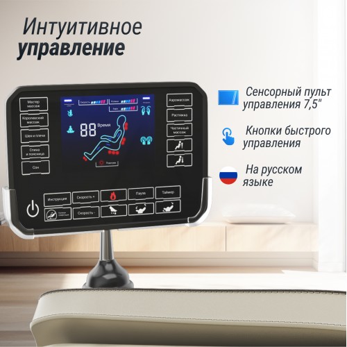 - Управляйте с легкостью! Интуитивно понятный сенсорный пульт управления в виде планшета располагается на подлокотнике. Массажное кресло оснащено поворотным переключателем для управления программами массажа. При необходимости в меню можно настроить подогрев, скорость, время. Широкий диапазон изменения уровня давления и времени поможет настроить массажный механизм под свои потребности