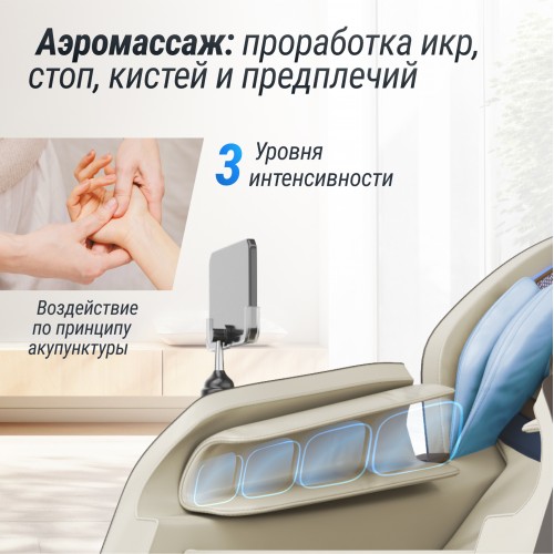 - Аэромассаж. Воздушно-компрессионный массаж со встроенными воздушными подушками расположенными по всему креслу оказывают воздействие на все тело человека. Воздушные подушки обеспечивают возможность выполнения легкого расслабляющего массажа, в результате нормализуется кровообращение и артериальное давление, убирается отечность, такой массаж благотворно влияет на лимфатическую систему, сердечно-сосудистую систему, на мышечные ткани. Чередование воздушной компрессии и обычного массажа благотворно сказывается на всех процессах в организме человека. Воздушно-компрессионный массаж рекомендован для коррекции фигуры, восстановления упругости кожи и ее эластичности.