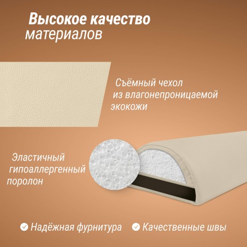 Экокожа, используемая для обивки, обладает высокой прочностью и устойчивостью к различным видам загрязнений. Она обеспечивает долговечность изделия, а также защиту от влаги, что особенно важно в условиях профессионального использования. В отличие от натуральной кожи, эко-кожа не требует сложного ухода и сохраняет свой первоначальный вид даже при интенсивной эксплуатации. Внутри валика для массажного кабинета находится эластичный поролон, который придает ему необходимую упругость и комфорт. Поролон равномерно распределяет нагрузку, поддерживая различные части тела — шею, спину, поясницу или ноги. Благодаря этому материалу, валик прекрасно адаптируется под индивидуальные анатомические особенности каждого клиента, создавая ощущение максимального удобства и релаксации во время процедур.