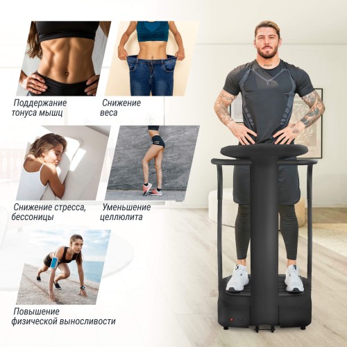 Консоль с 3-мя стикерами отображает всю необходимую информацию: время тренировки, скорость вибрации, а также кнопку запуска и остановки тренажера. Вибро платформа для похудения предлагает несколько режимов работы. Максимальный вес пользователя 150 кг. Ножки можно отрегулировать.