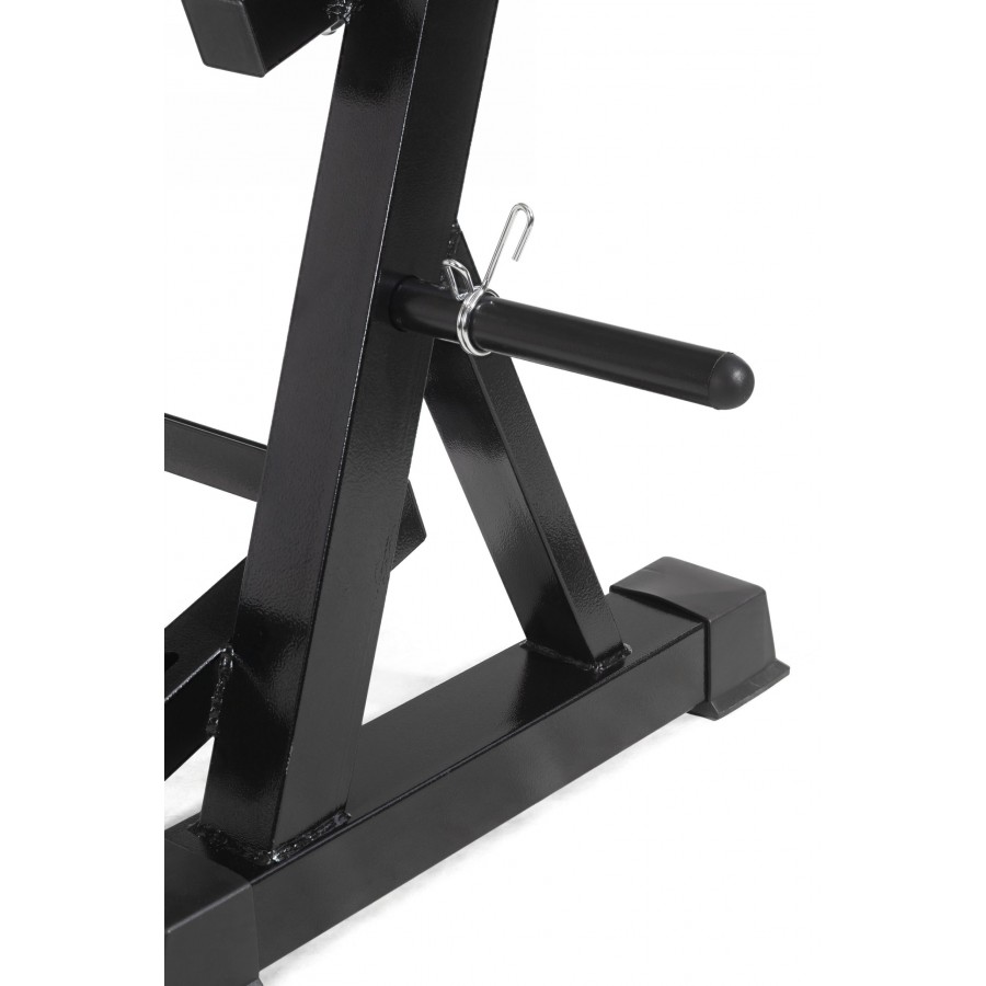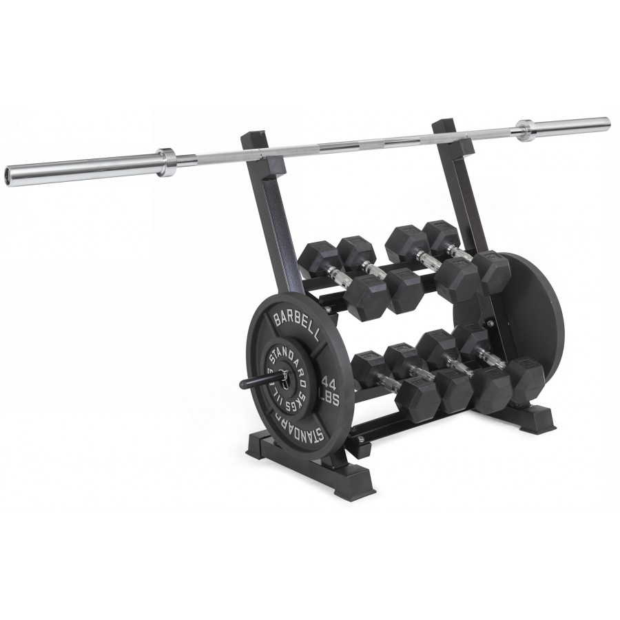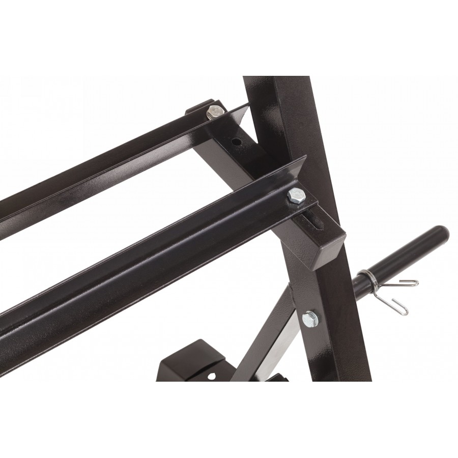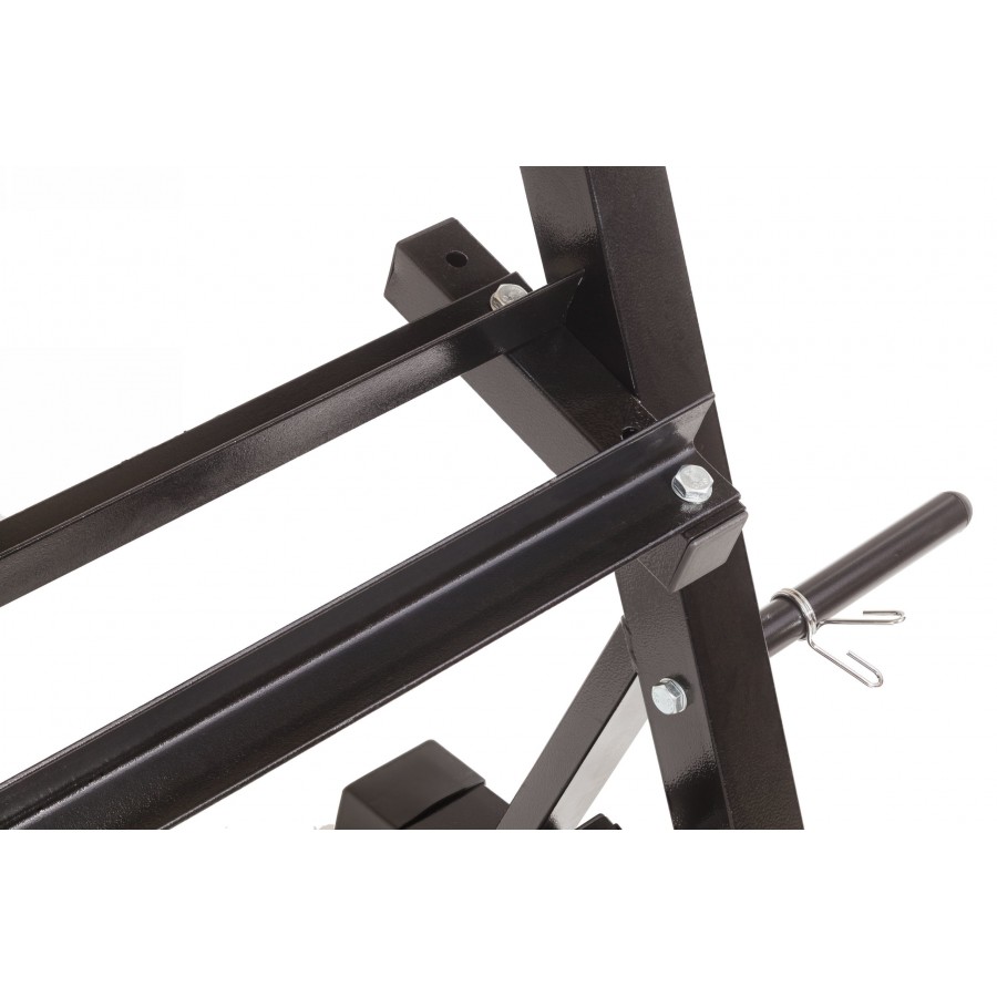 Максимальная нагрузка – до 200 кг, что позволяет размещать гантели и диски разного веса.